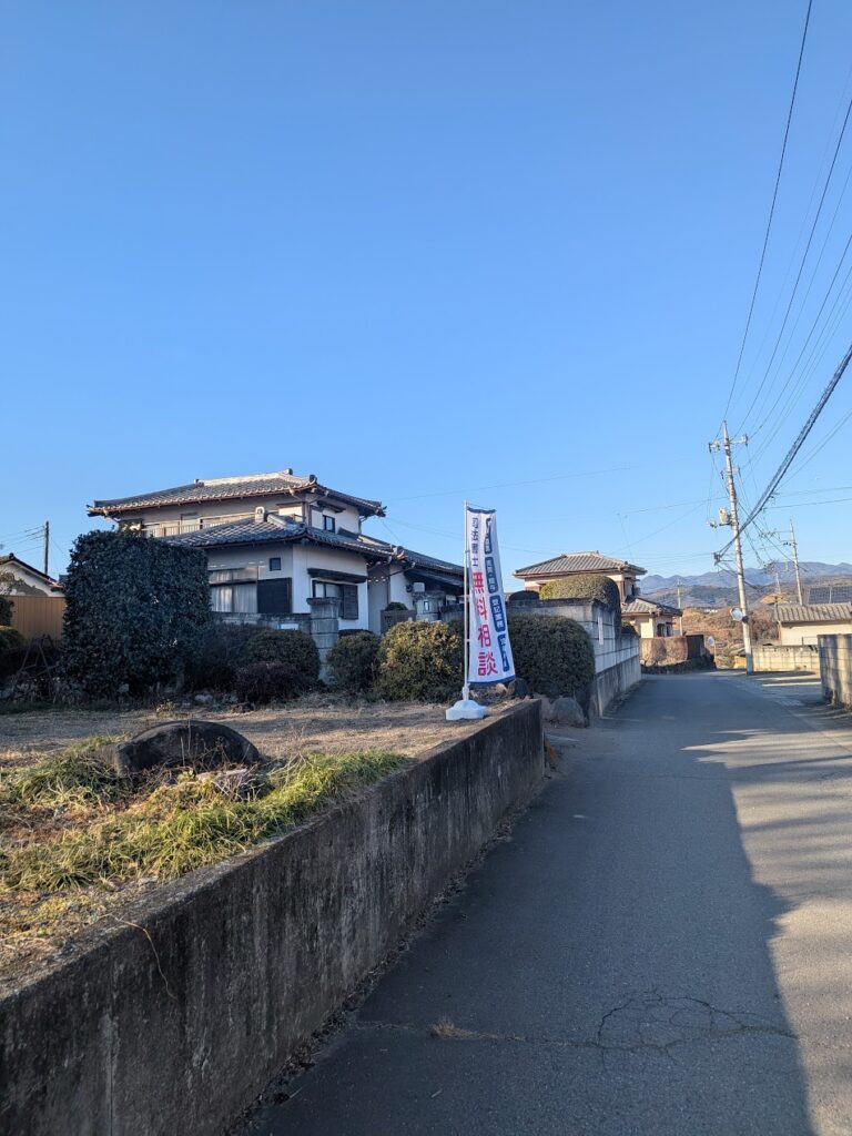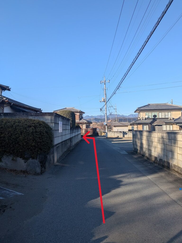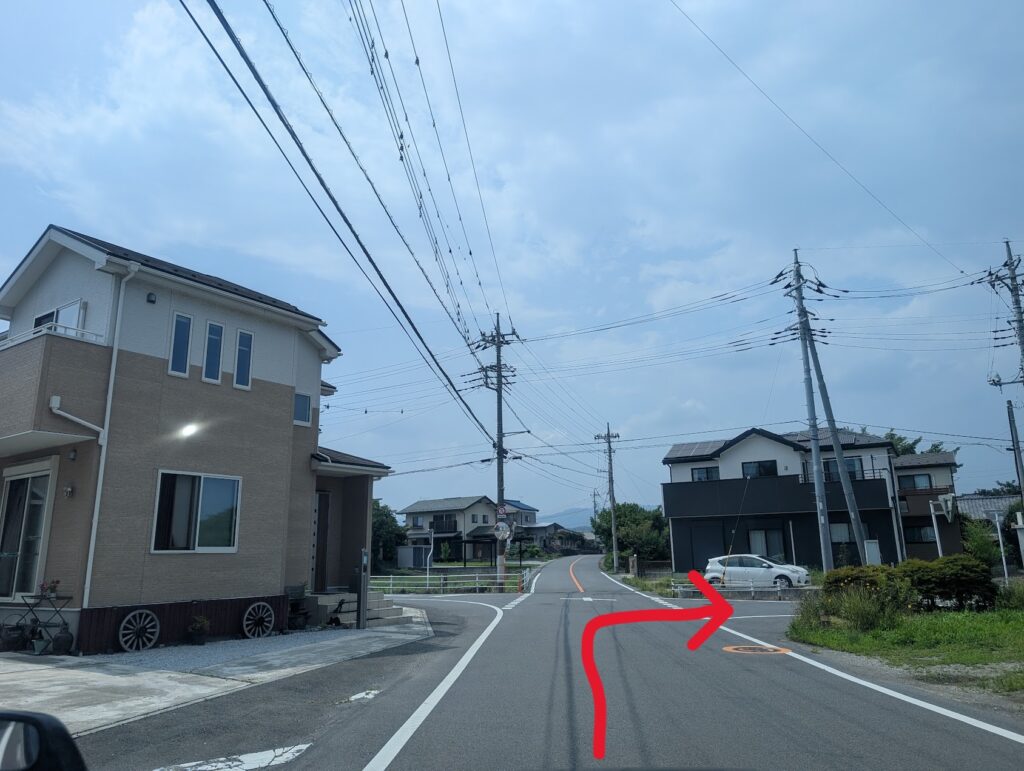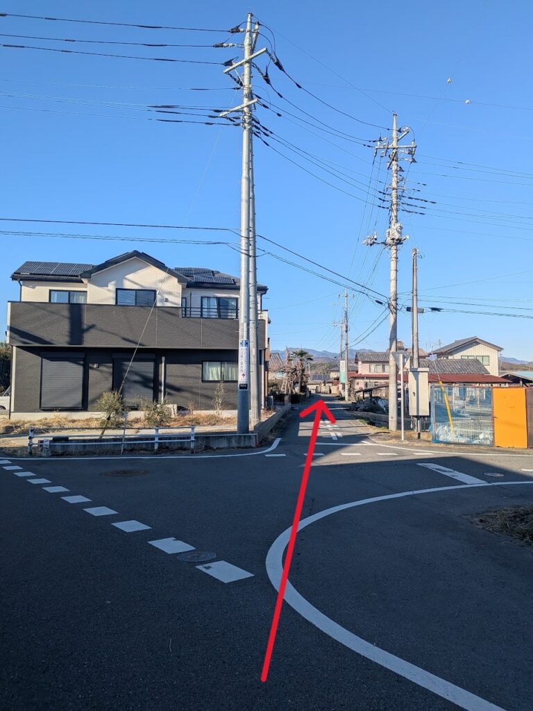 坂を下り三叉路に差し掛かったら、右折し、電柱に当事務所の看板がございますのでそちらの方に進みます。